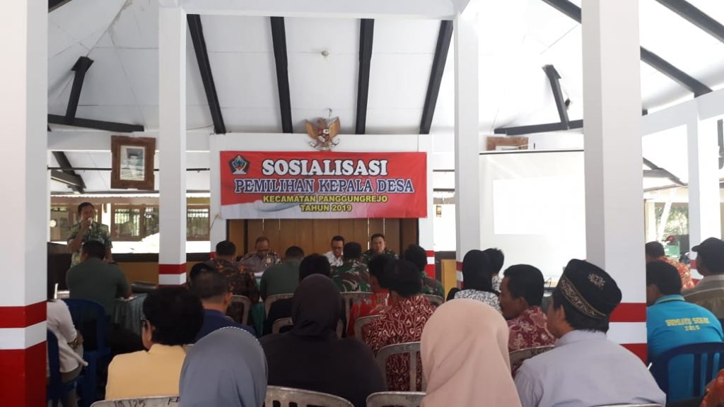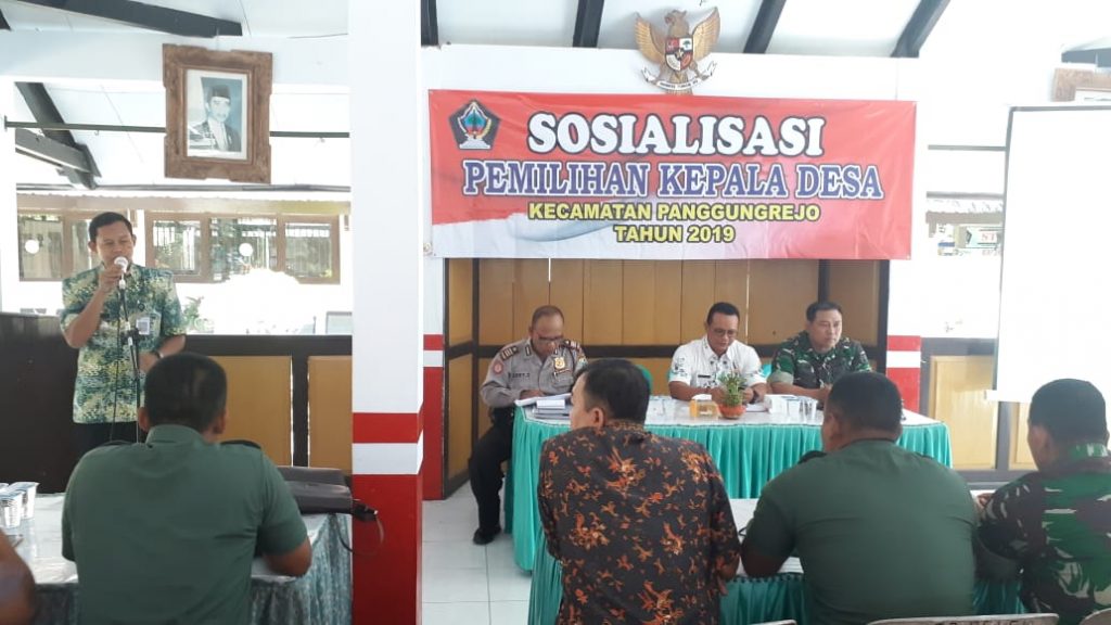 Panggungrejo-Pemerintah Kecamatan Panggungrejo mengadakan sosialisasi pemilihan Kepala Desa Tahun 2019 di Pendopo Kecamatan Panggungrejo dengan Narasumber Kabag Pemerintahan Kabupaten Blitar Bapak Bambang Dwi Purwanto, S.STP, M.Si pada Jum’at (5/7/2019). Kegiatan ini diikuti oleh Muspika, Kepala Desa beserta Perangkat, Panitia Pilkades, BPD, Babinsa dan Babinkamtibmas dari 6 (enam) Desa yang akan mengadakan Pilkades serentak yaitu Desa Kalitengah, Bumiayu, Panggungasri, Kaligambir, Serang, Sumberagung. Acara ini dibuka oleh Bapak Camat Panggungrejo dan diteruskan oleh Narasumber yang menerangkan dengan jelas tentang aturan-aturan yang berkaitan dengan Pilkades. Sosialisasi ini berlangsung lancar dan tertib sampai dengan selesai. (Agp-)